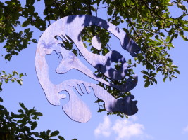 Mein Wunsch entstand, in einen leisen Dialog zu treten, in einen assoziativen Prozess der Gestaltung einzusteigen. „Der Himmelsbaum“ war das erste, was mir gefiel. Ein toter Baum voller Leben war ein Symbol für den steten Wechsel zwischen Leben und Tod und stellte gleichzeitig die Frage: Wann ist Leben und wann ist Tod? Ein alter Apfelbaum mit einem wundervollen Schwung in seinen Ästen bot sich an, Kristalle aufzunehmen und ein Holzbild „Die Liebenden“ . So entstand der „Baum der Tränen“, Tränen der Trauer und Freude. Weiter oben war im Laufe der Zeit ein kleines Plateau entstanden. Ein idealer Platz für ein kleines und doch feines Labyrinth.