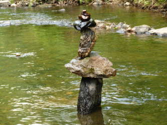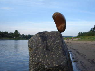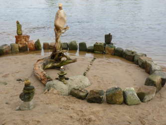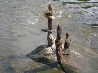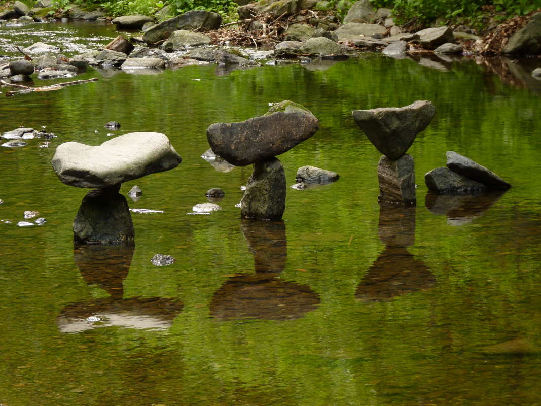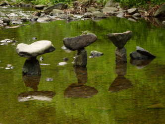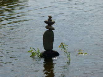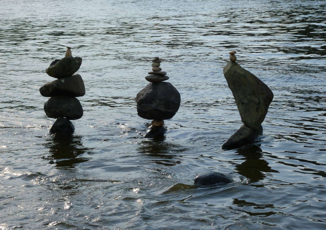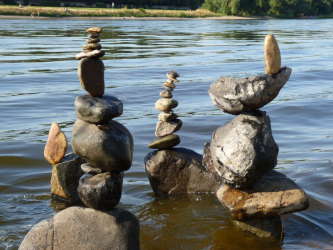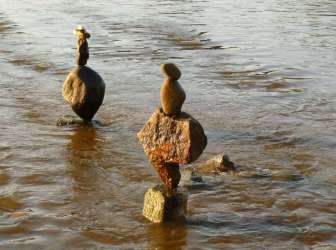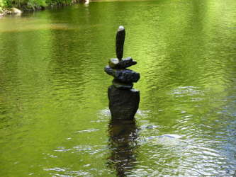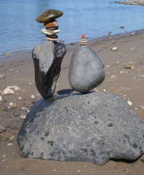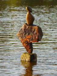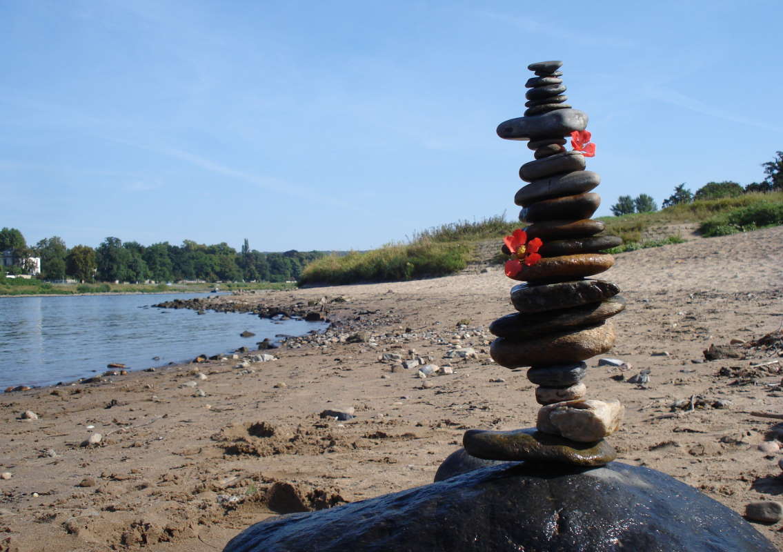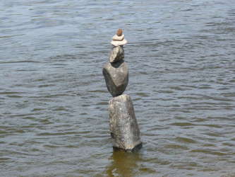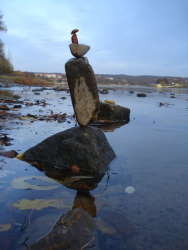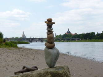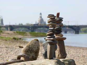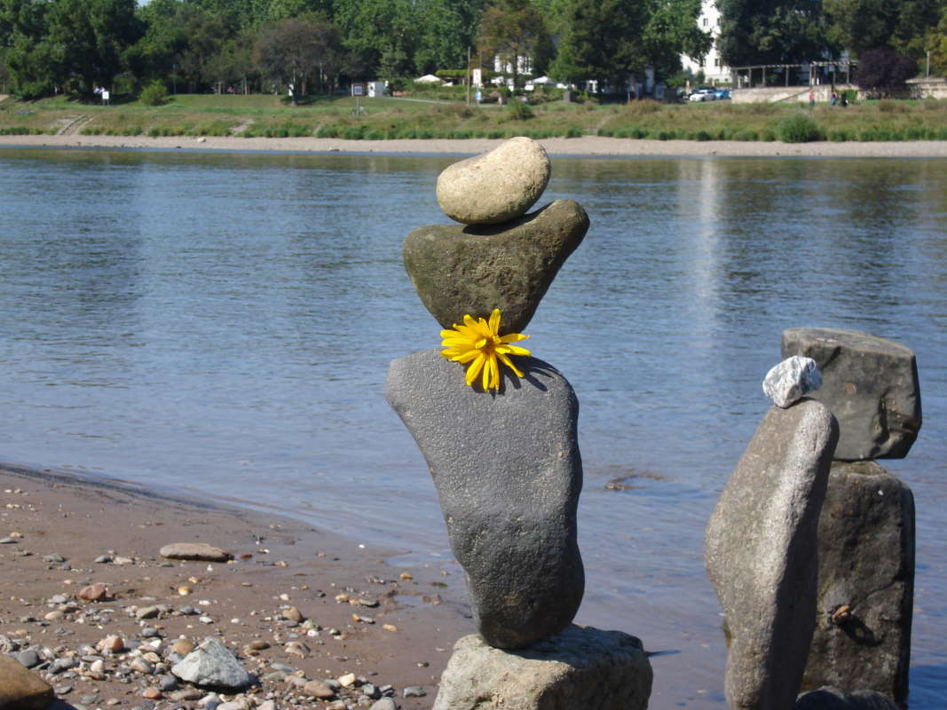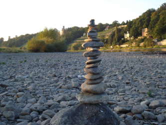 "Wächter" nenne ich die Plastiken aus Geröllsteinen, die ich an der Elbe oder an der Roten Weisseritz (Rabenauer Grund) gefunden habe und die ohne Hilfsmittel (Klebstoffe, Konstruktionen ...) ausbalanciert stehen. Ich wurde einmal gefragt, weshalb ich sie "Wächter" nenne, obwohl sie von einem starken Windstoß oder Wellen umstürzen können: Sie erinnern die Vergänglichkeit des Lebens und fordern uns zu Achtsamkeit auf. |