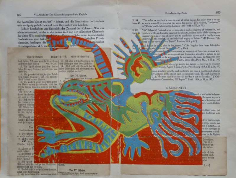 (eine Seite aus dem Marxschen Kapital, eine Seite der Bibel und vier Platten Linoldruck aus der verlorenen Form)